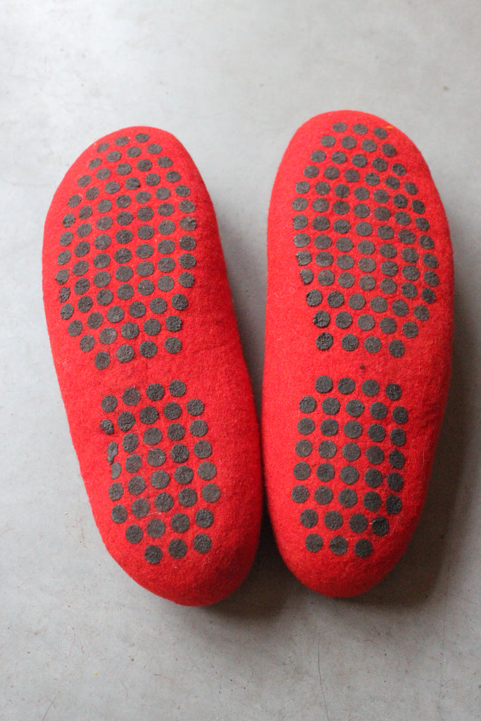 Our felted slippers are hand made and fair trade. The slippers are cozy and comfortable footwear with latex protection on the soles. An all time favorite, all year round. The red round slippers are also available in european size 37,42,43