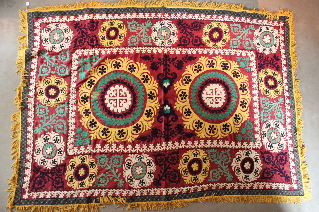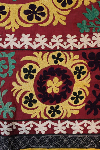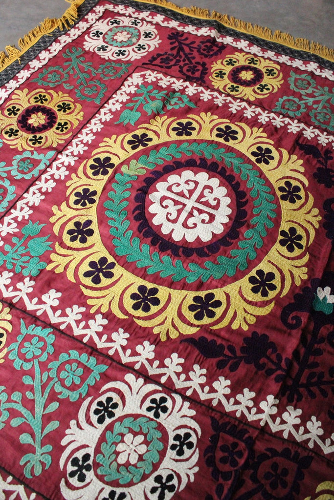 This vintage suzani has beautiful floral design on a cotton bordeaux background